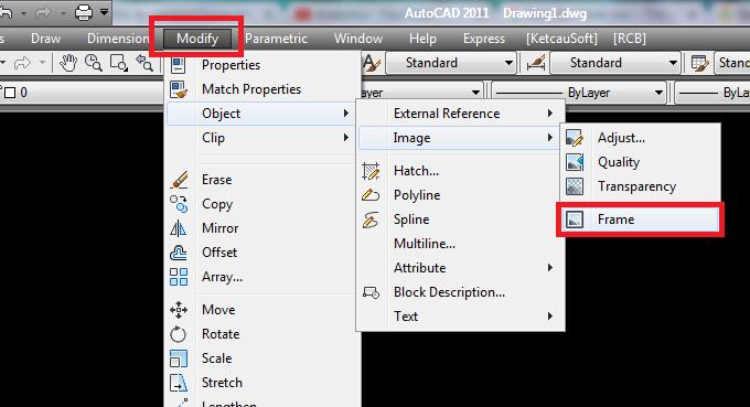 Tuy nhiên trong một số trường hợp, người dùng không muốn đường viền này xuất hiện. Để thực hiện điều đó, người dùng cần chuyển chế độ tắt khung của ảnh ở trong AutoCAD, bằng cách click vào menu: Modify > Object > Image > Frame