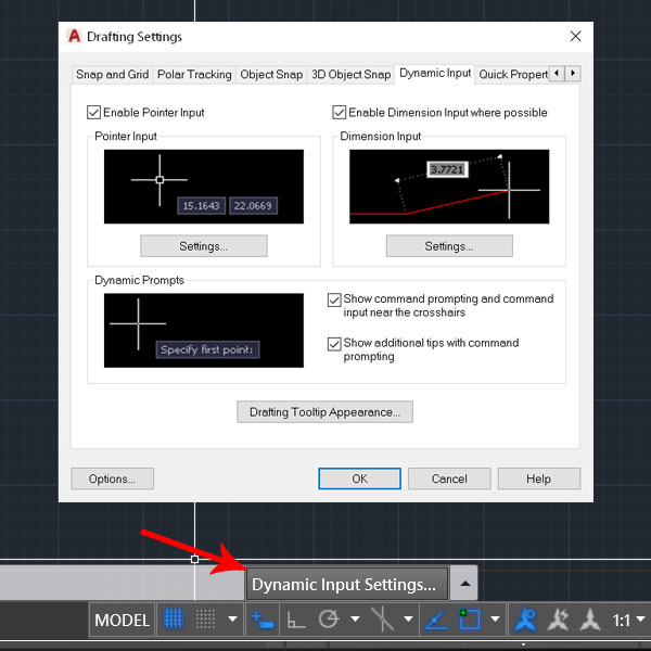 Bảng cài đặt Dynamic Input: Kích chuột phải vào biểu tượng Dynamic Input ở thanh công cụ dưới, kích vào Dynamic Input Setting…thì xuất hiện bảng cài đặt Drafting Settings.