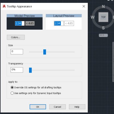 Drafting Tooltip Appearance: kích hộp này sẽ hiện ra bảng cài đặt cho hộp thoại tooltip (như hình dưới)