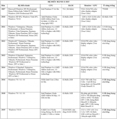 Cấu hình yêu cầu của laptop chạy AutoCad các phiên bản hệ điều hành 32 bit
