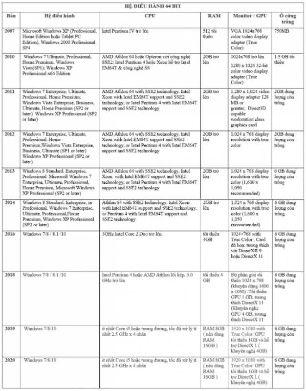 Cấu hình yêu cầu của laptop chạy AutoCad các phiên bản hệ điều hành 64 bit