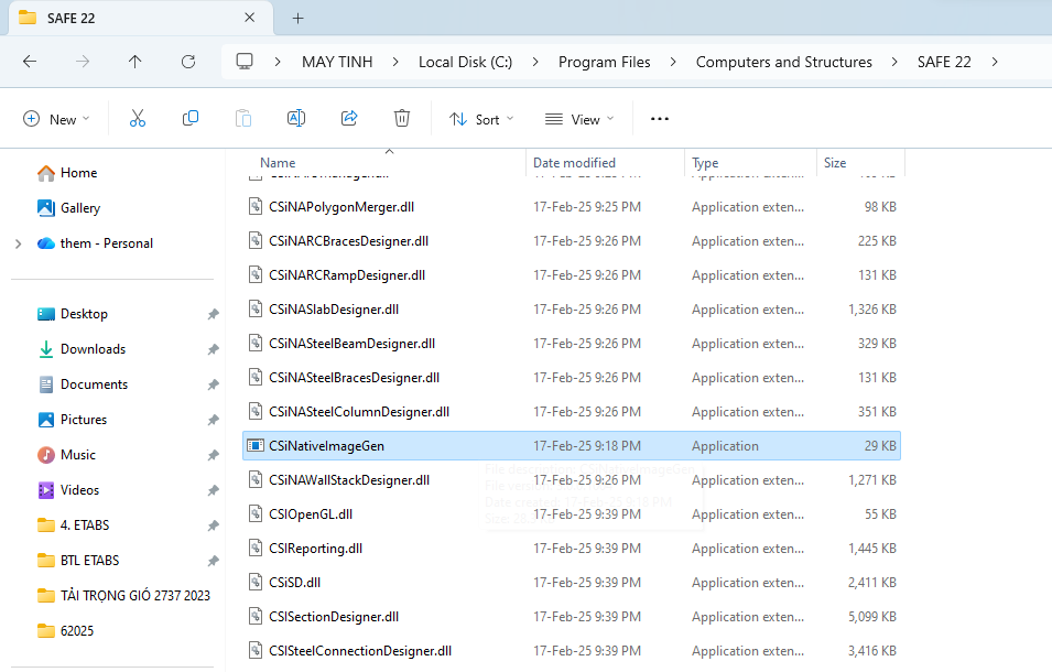 BƯỚC 8: Truy cập vào đường dẫn như hình dưới: C:\Program Files\Computers and Structures\SAFE 22, mở file CSiNativeImageGen với Run as Adminstrator