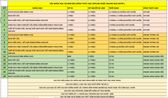 Học phí và số buổi học các bạn xem kỹ ở bảng dưới đây