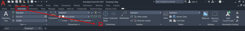 Cách 2: Click vào biểu tượng mũi tên góc dưới cùng bên phải ở dải ribbon Dimemsions của Annotate