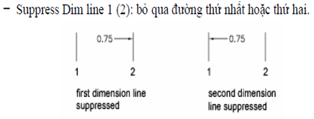 - Suppress: Loại bỏ (Nếu tích vào “Dim line 1″ Phần mềm sẽ bỏ đường kích thước 1 hoặc bỏ đường kích thước 2 nếu click vào Dim line 2”)