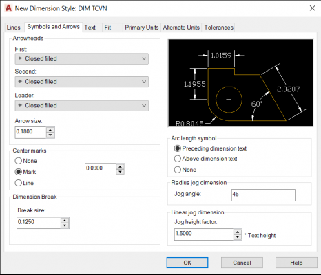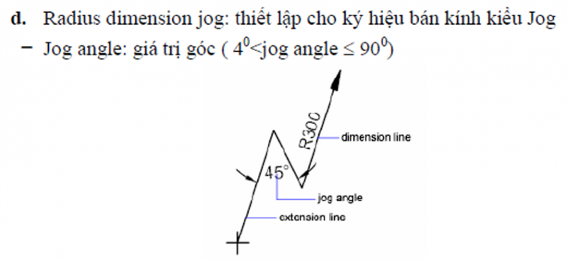 - Jog angle: Thiết lập góc nghiêng của đường chéo so với 2 đường thẳng song song khi DIM cung trong kiểu Jog.