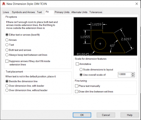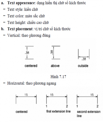 - Text placement: Nhóm thiết lập vị trí text so với đường kích thước.