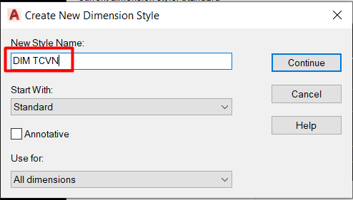 Ở thẻ New Style Dimension Style ta đặt tên là TCVN.