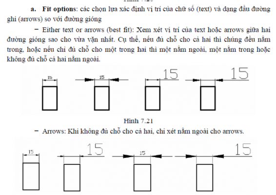 – Over the dimension line, with a leader: Chữ text nằm ngoài đường kích thước nếu không đủ chỗ và không xuất hiện đường dẫn