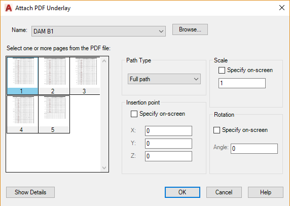 Bước 3: Bật CAD lên chọn Insert PDF, tìm tới đường link file PDF và click OK để hộp thoại Attach PDF Underlay hiện ra: