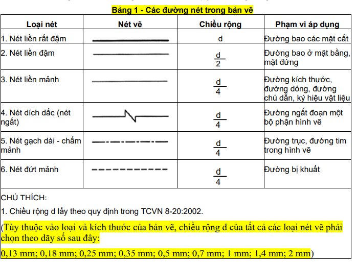Tiêu chuẩn quy định các loại đường nét trên các bản vẽ của hồ sơ thiết kế.