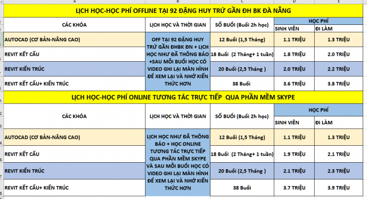 Học phí và số buổi học các bạn xem kỹ ở bảng dưới đây